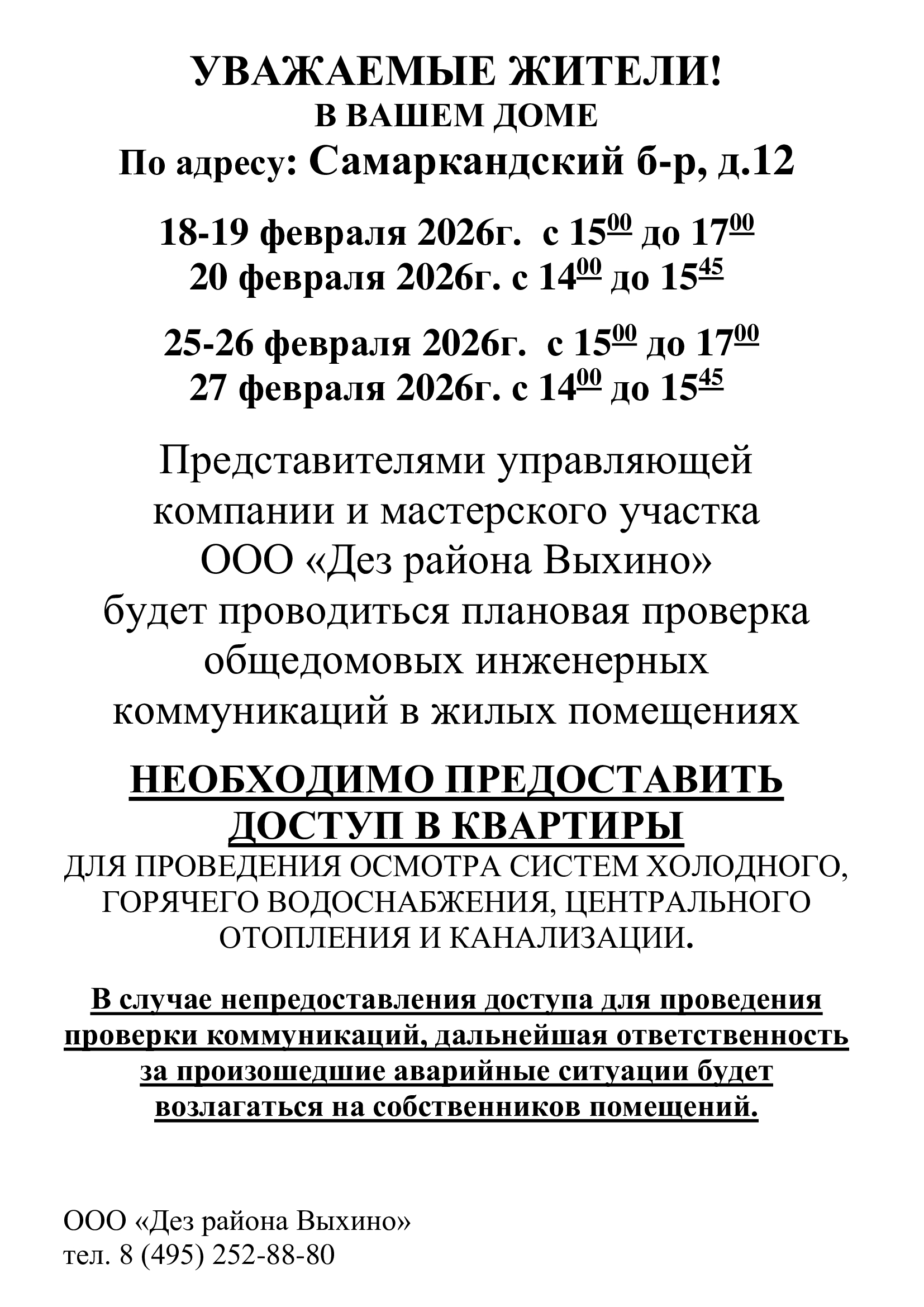 Проведение плановой проверки инженерных коммуникаций в квартире по адресу: Самаркандский бульвар дом 12