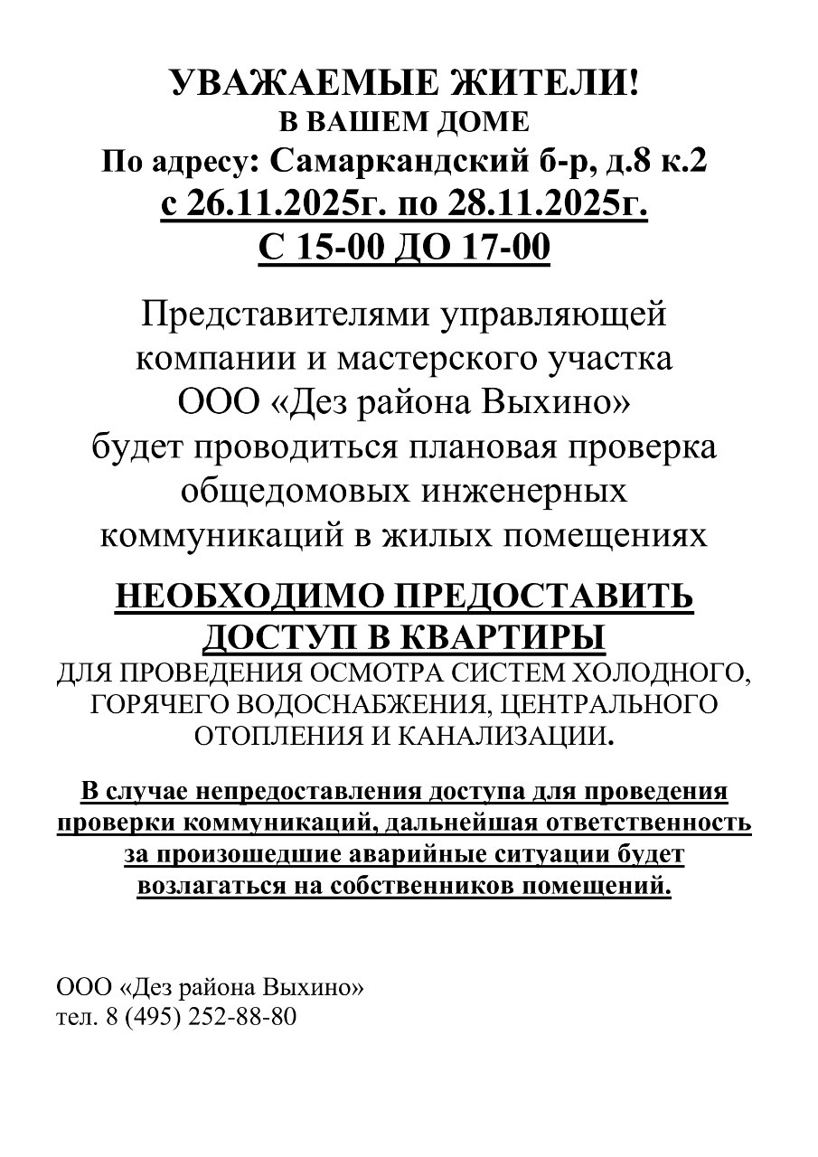 Проведение плановой проверки инженерных коммуникаций в квартире по адресу: Самаркандский бульвар дом 8 корпус 2