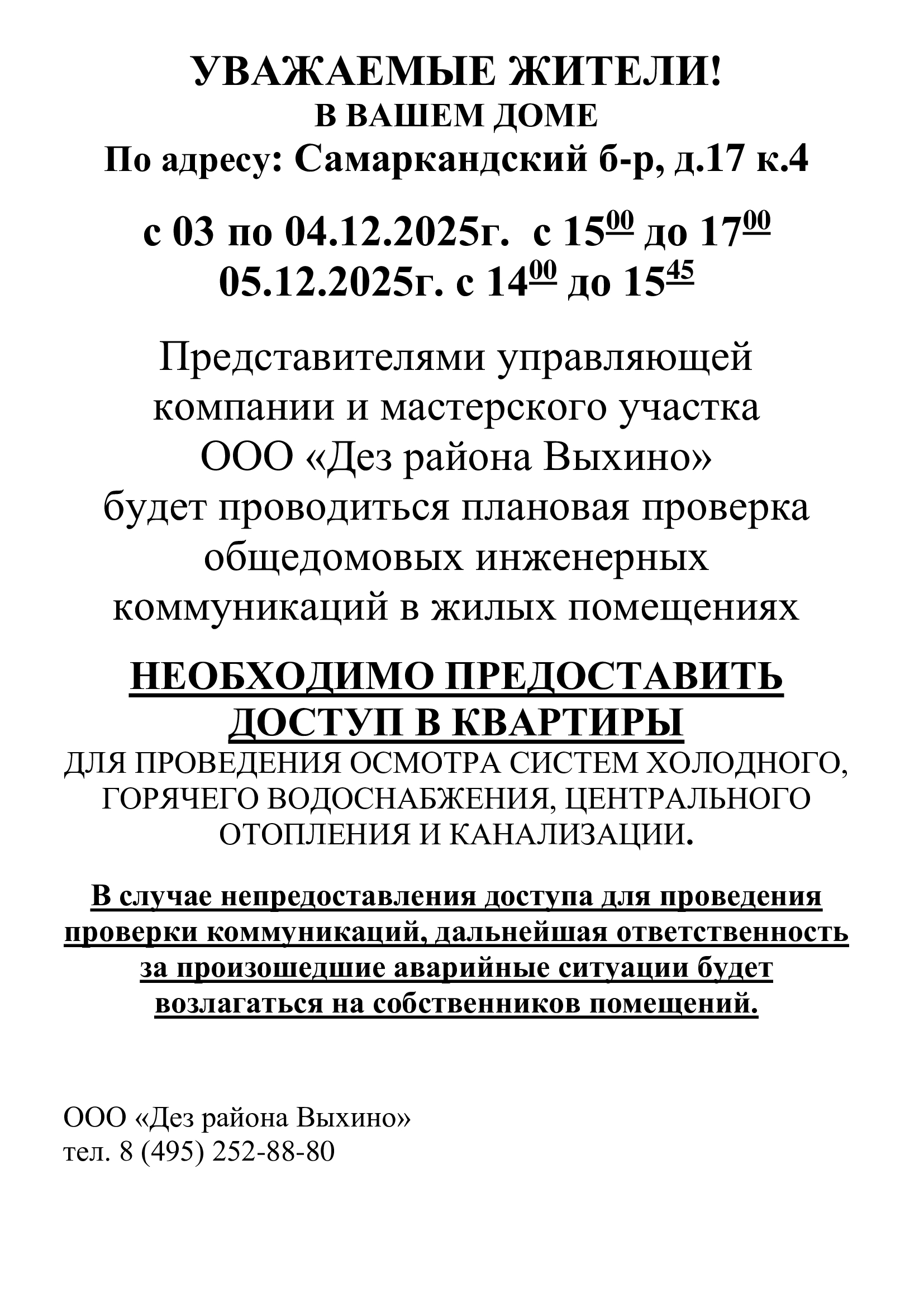 Проведение плановой проверки инженерных коммуникаций в квартире по адресу: ул. Самаркандский бульвар дом 17 корп. 4