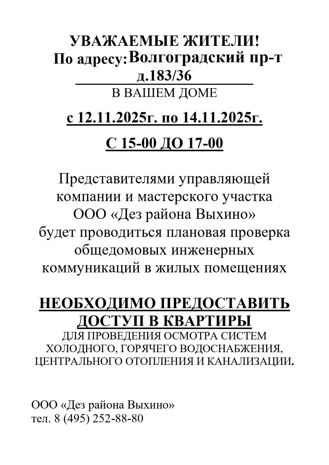 Проведение плановой проверки инженерных коммуникаций в квартирах по адресу Волгоградский проспект 183/36