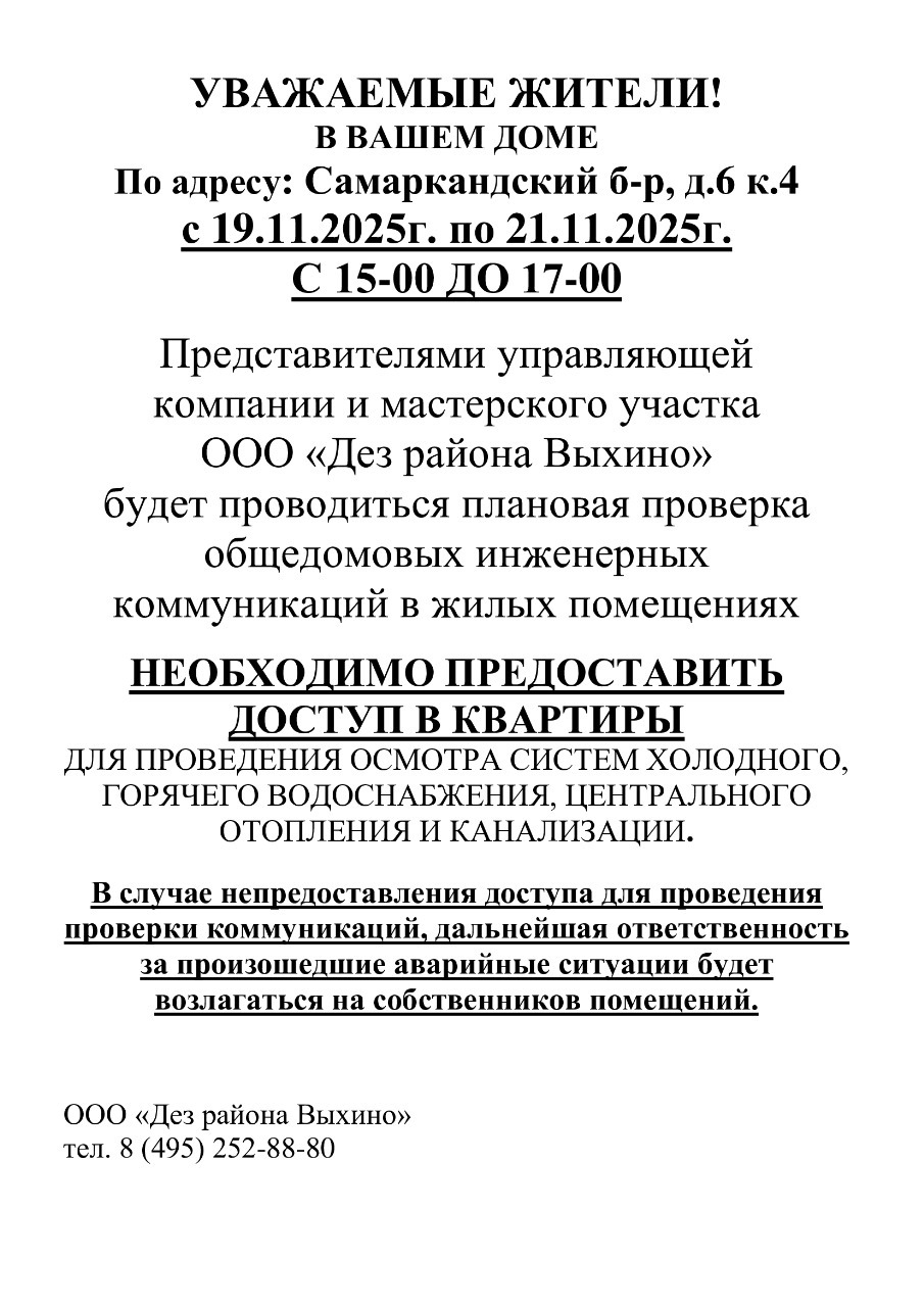 Проведение плановой проверки инженерных коммуникаций в квартире по адресу Самаркандский бульвар дом 6 корпус 4
