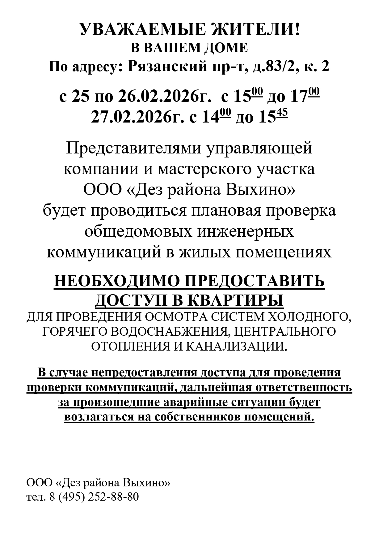 Проведение плановой проверки инженерных коммуникаций в квартире по адресу: ул. Рязанский проспект дом 83/2 корпус 2